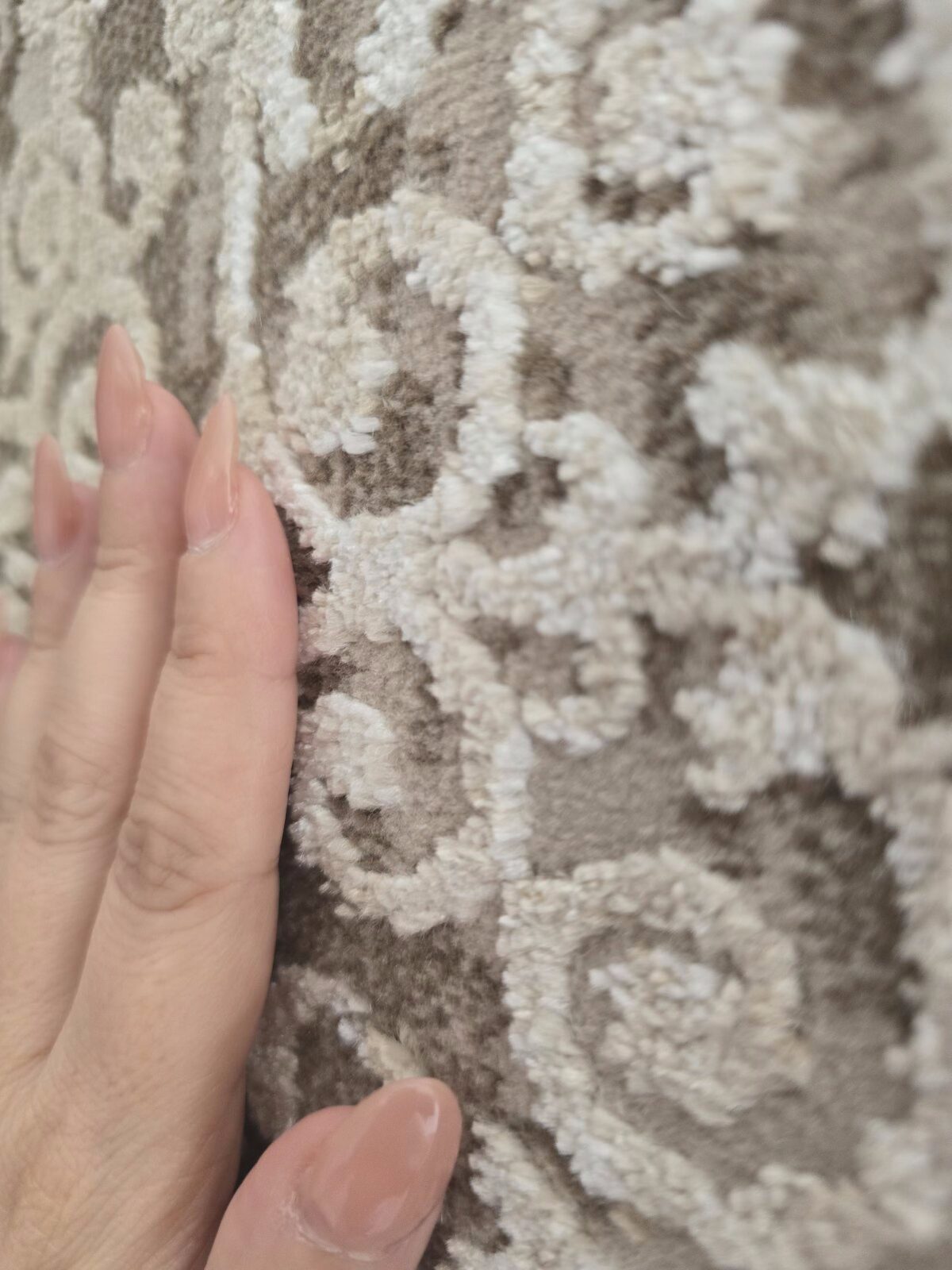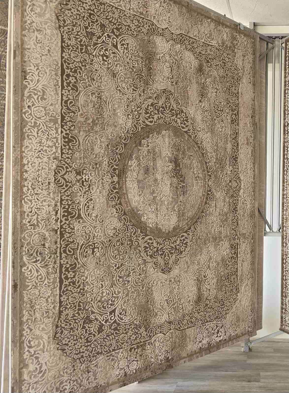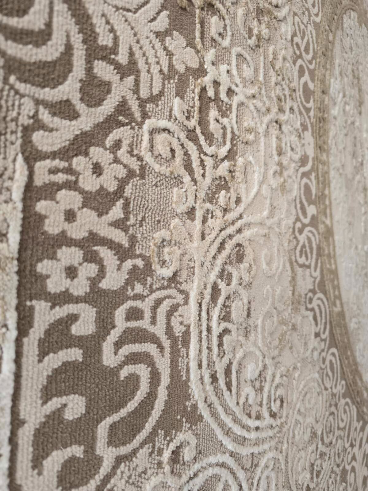 Ανάγλυφο πολυτελές χαλί μεταξωτής υφής, 100% αλέκιαστο σε χρώματα μπεζ βιζόν.